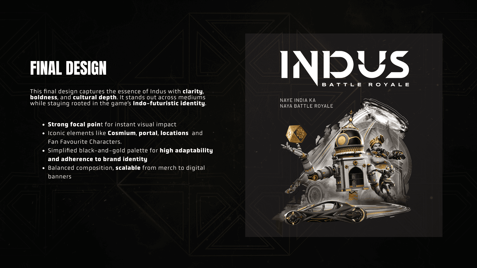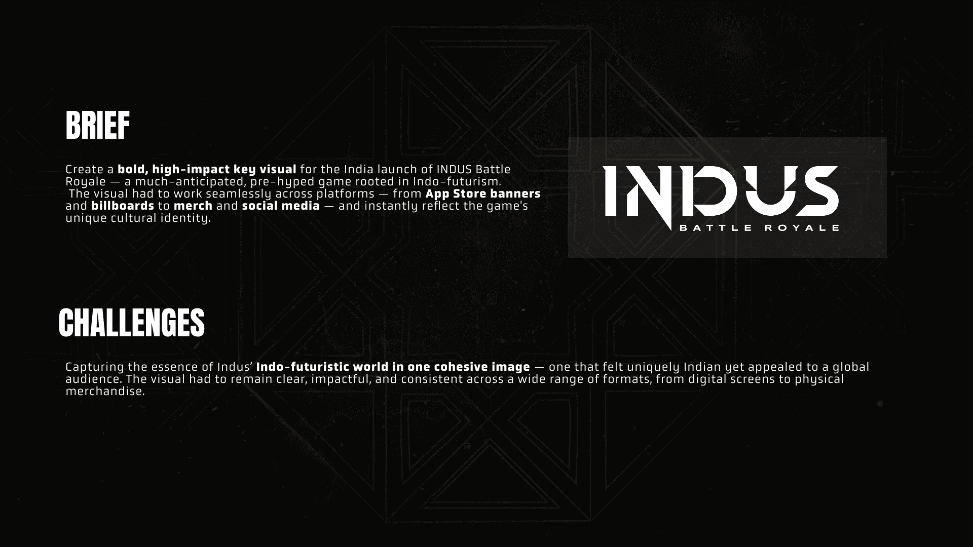 I was tasked with creating the official key visual for the launch of Indus Battle Royale—India’s first major Indo-futuristic battle royale game. My goal was to craft an image that would capture the game’s unique blend of Indian heritage and science fiction, setting the tone for its worldwide marketing campaign.